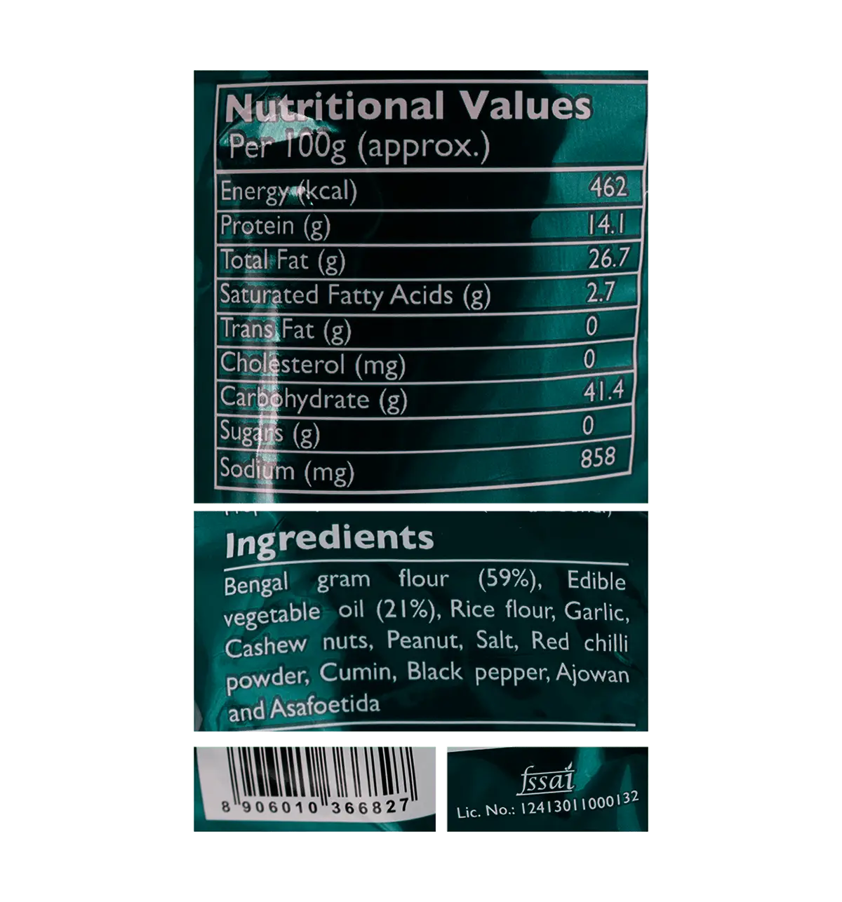 Bengal gram flour (59%), Edible vegetable oil (21%), Rice flour, Garlic, Cashew nuts, Peanut, Salt, Red chilli powder, Cumin, Black pepper, Ajowan and Asafoetida